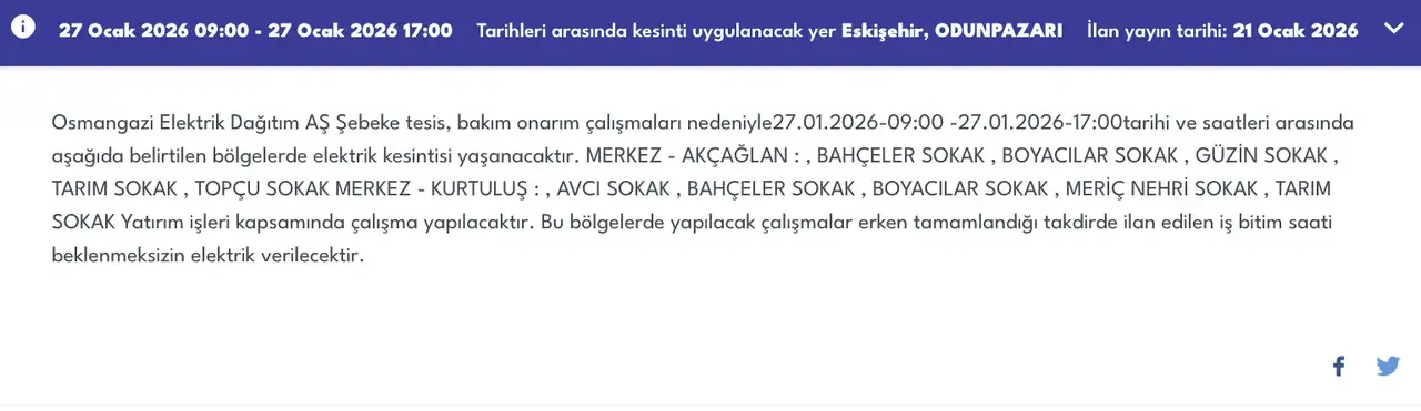 Eskişehir genelinde 27 Ocak 2026 Salı günü şebeke tesis, bakım ve onarım çalışmaları nedeniyle geniş kapsamlı elektrik kesintileri yaşanacak. Osmangazi Elektrik Dağıtım A.Ş. (OEDAŞ) tarafından yapılan duyuruya göre; Odunpazarı, Tepebaşı, Mahmudiye, Günyüzü, İnönü ve Han ilçelerindeki birçok mahalle ve işletme planlı kesintilerden etkilenecek.