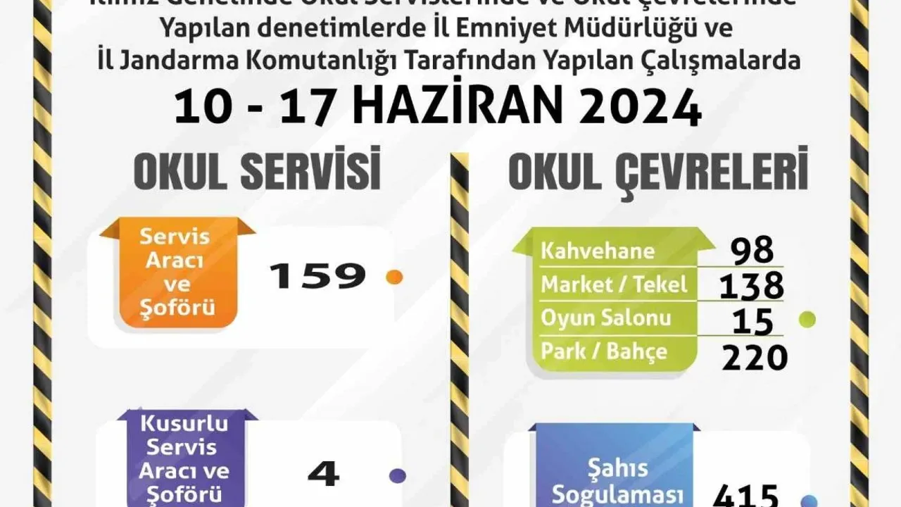 Edinilen bilgiye göre, İl Emniyet Müdürlüğü ve İl Jandarma Komutanlığı ekipleri tarafından okul servislerinde ve okul çevrelerinde denetim yapıldı. İl genelinde 10 ila 17 Haziran tarihleri arasında gerçekleştirilen çalışmada 159 servis aracı ve şoförü kontrol edilirken, kusurlu bulunan 4 servis aracının sürücüsüne ceza kesildi. Okul çevrelerinde ise 98 kahvehane, 138 market ve tekel, 12 oyun salonu ve 220 park ile bahçe kontrol edildi. Ayrıca 415 şahsa kimlik sorgusu yapıldı.