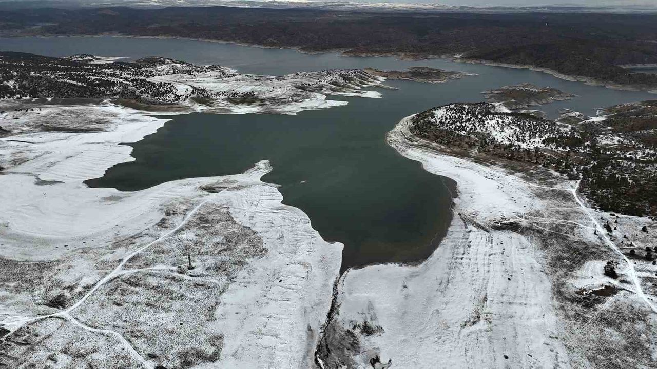 Kütahya’nın Kalburcu Çiftliği Mahallesi’nde bulunan ve Eskişehir’in içme, kullanma ve sulama suyunu temin eden 454 milyon metreküp işletme hacmine sahip Porsuk Barajı’nın karla kaplı hali dronla havadan görüntülendi. Beyaza bürünen baraj manzarası görsel açıdan güzel görüntüler sunsa da su seviyesindeki düşüş dikkat çekti.