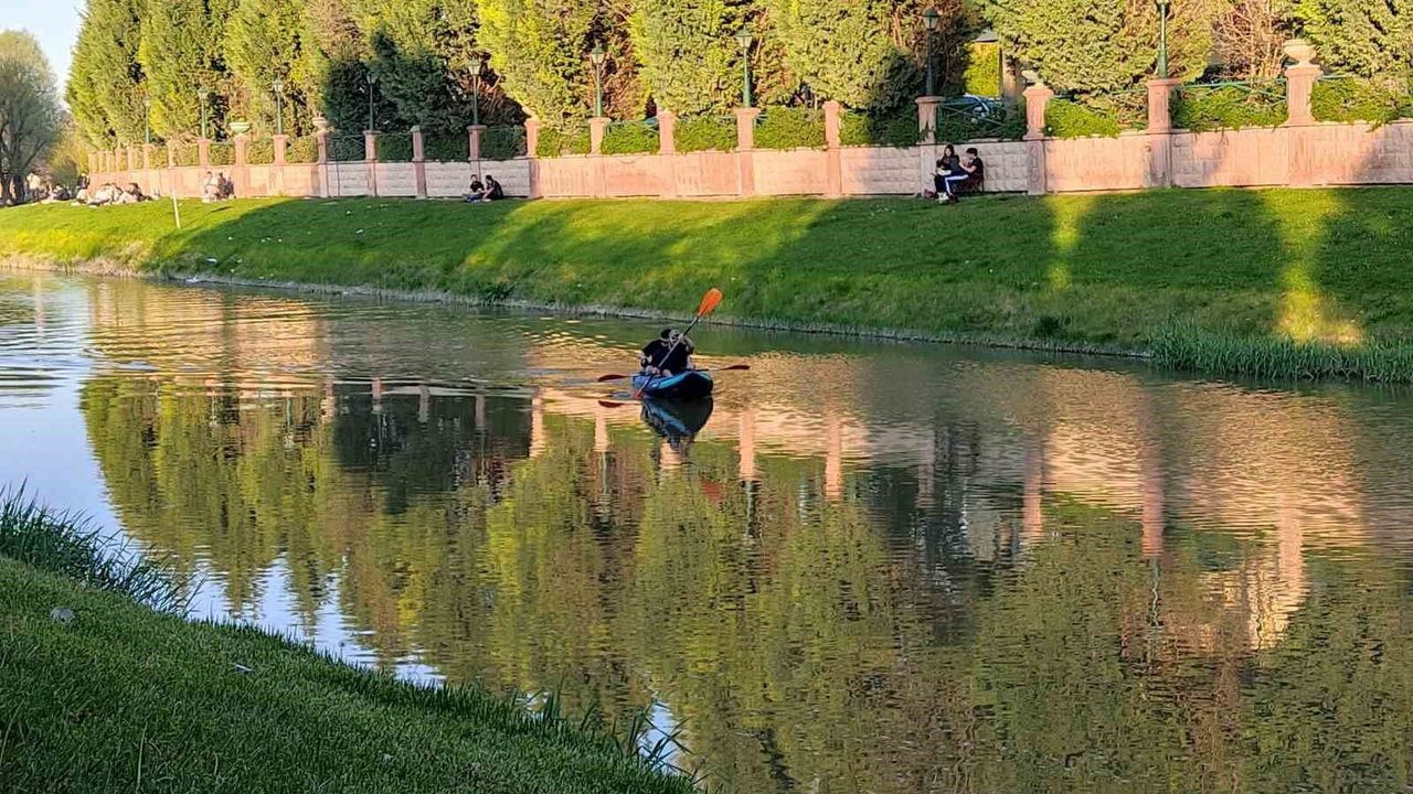 Odunpazarı ilçesinde yer alan parkın iskelesinden kanolarıyla suya açılan iki genç, Porsuk Çayı üzerinde kürek çekti. Çay boyunca ilerleyen gençlerin keyifli anlar yaşadığı ve güzel havanın tadını çıkardığı ifade edildi.
