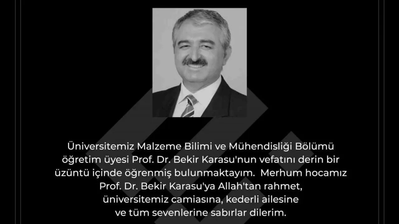 ESTÜ Mühendislik Fakültesi Malzeme Bilimi ve Mühendisliği Bölümü Malzeme Bilimi ve Mühendisliği Anabilim Dalı'nda görevli olan Prof. Dr. Bekir Karasu'nun cansız bedeni, 27 Haziran Perşembe günü sonrası kendisinden bir daha haber alınamamasının ardından dün Karacaşehir mevkiinde Porsuk Çayı içinde eli ve ayakları bağlanmış halde bulundu. Olayla ilgili polis ekiplerinin çalışmaları sürerken, ESTÜ Rektörü Prof. Dr. Adnan Özcan bir mesaj yayımladı. Mesajında Karasu'nun yakınlarına ve sevenlerine sabırlar dileyen Özcan, "Üniversitemiz Malzeme Bilimi ve Mühendisliği Bölümü öğretim üyesi Prof. Dr. Bekir Karasu'nun vefatını derin bir üzüntü içinde öğrenmiş bulunmaktayım. Merhum hocamız Prof. Drr. Bekir Karasu'ya Allah'tan rahmet, üniversitemiz camiasına, kederli ailesine ve tüm severlerine sabırlar dilerim" ifadelerine yer verdi.