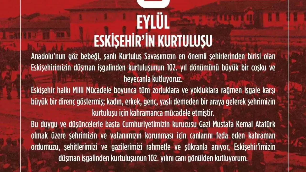 Eskişehir'de Anadolu Üniversitesi Rektörü Prof. Dr. Kemal Şenocak, 2 Eylül Eskişehir'in Düşman İşgalinden Kurtuluşu'nun 102'nci yılı dolayısıyla mesaj yayımlayarak, "Eskişehir halkı Milli Mücadele boyunca tüm zorluklara ve yokluklara rağmen işgale karşı büyük bir direnç göstermiştir" dedi.