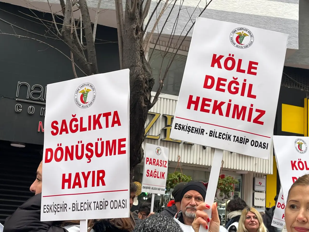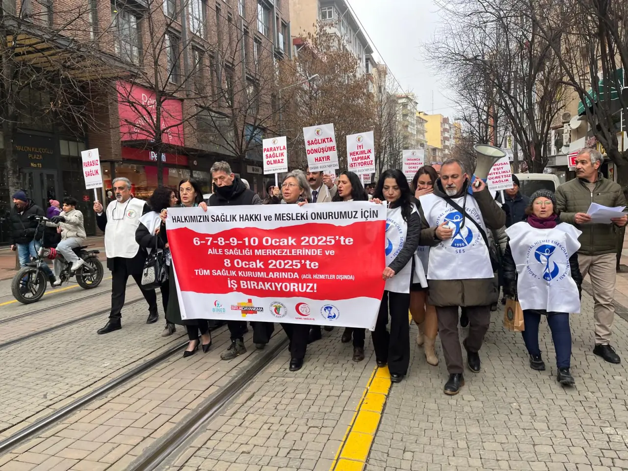 Eskişehir-Bilecik Tabip Odası ve sağlık çalışanları, sağlık sistemini eleştirmek amacıyla, 6-10 Ocak iş bırakma eylemlerinin son gününde Doktorlar Caddesi'nden Eskişehir İl Sağlık Müdürlüğü'ne yürüdüler.