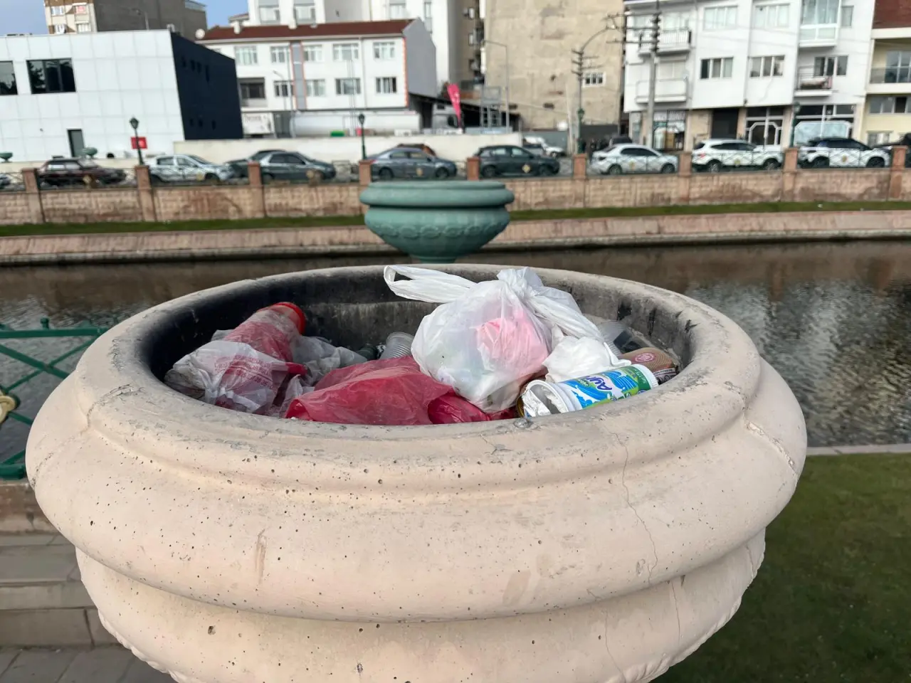 Eskişehir’in en önemli simgelerinden biri olan Porsuk Çayı, estetik dokusuyla hem yerli hem de yabancı turistlerin ilgisini çekiyor. Ancak, Savtekin Caddesi üzerinde bulunan ve çayın estetiğini tamamlaması için yerleştirilen saksılar, amacına uygun kullanılmak yerine çöp kutusuna dönüşmüş durumda.