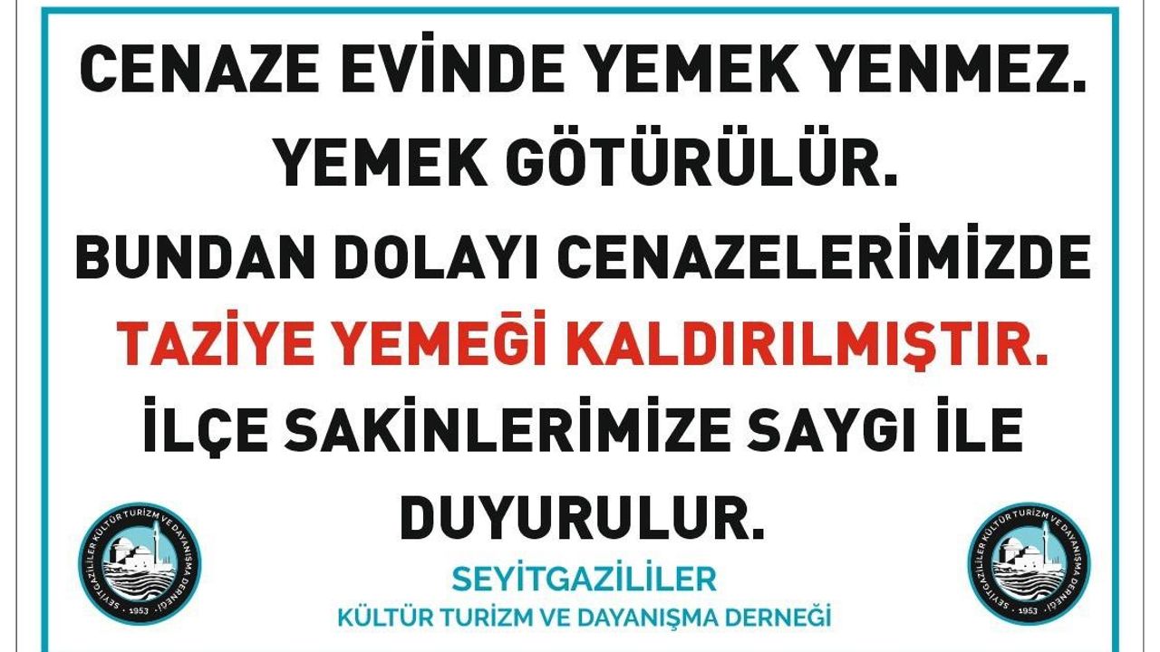 Dernek yetkililerince yapılan yazılı açıklamada, taziye yemeği geleneğinin, cenaze sahipleri üzerinde maddi ve manevi anlamda ağır bir yük oluşturduğu ifade edildi. Açıklamada, “Cenaze evinde yemek yenmez, yemek götürülür. Bu kadim anlayışa ve Peygamber Efendimiz Hz. Muhammed (S.A.V)’in sünnetine uygun olarak, Seyitgazi’de taziye yemeği uygulaması kaldırılmıştır. Sünnete göre, vefat eden kişinin yakınlarına destek olmak amacıyla yemek yapmak ve götürmek tavsiye edilmiştir. Bu doğrultuda; cenaze sahibi aileden yemek ikramı beklenmemesi, aksine onların yükünü hafifletmek için destek olunması uygun görülmektedir” denildi.