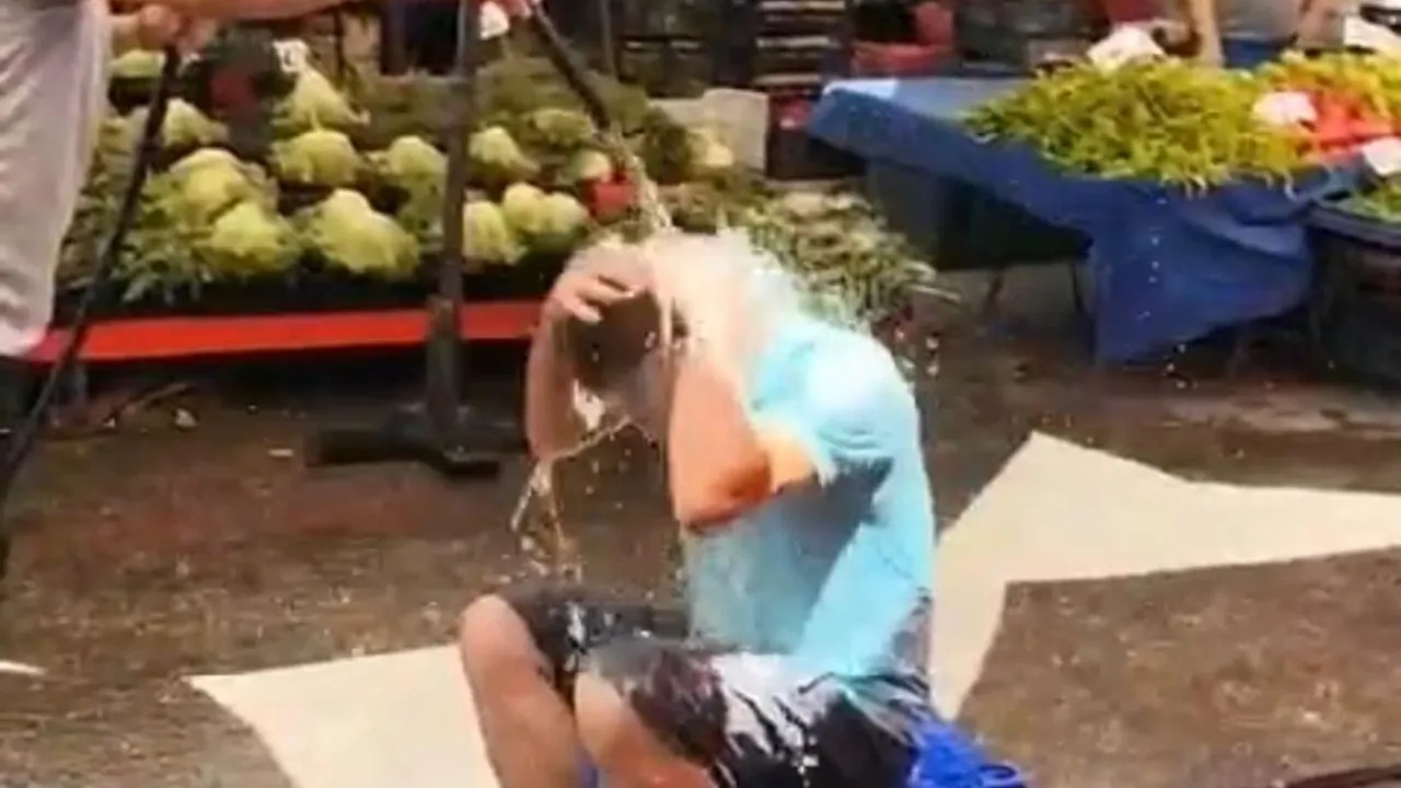Pazarcının görenleri hayrete düşüren serinleme yöntemi, başka bir pazarcı tarafından cep telefonu kamerası ile kaydedildi.
