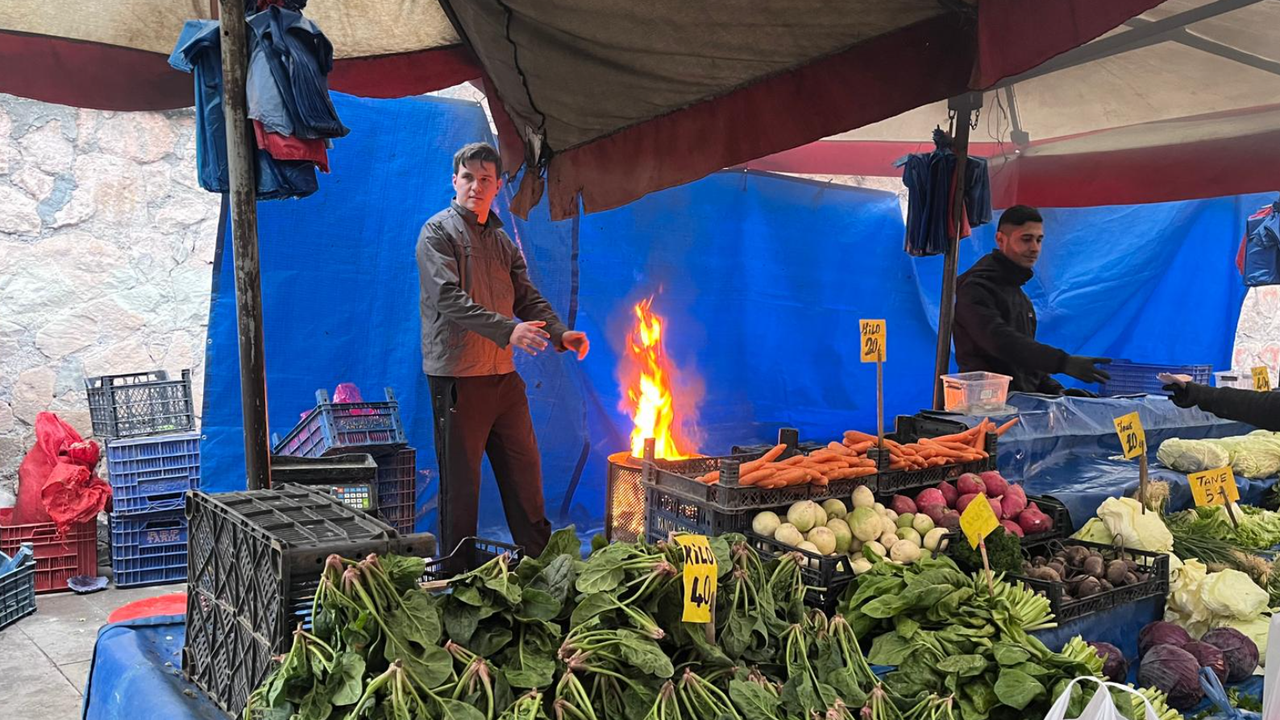 Eskişehir’de etkili olan soğuk ve yağmurlu hava, pazarcı esnafını olumsuz etkiledi. Tezgâhlarının başında satış yapan pazarcılar, soğuktan korunmak için ateş yakarak ısınmaya çalıştı.