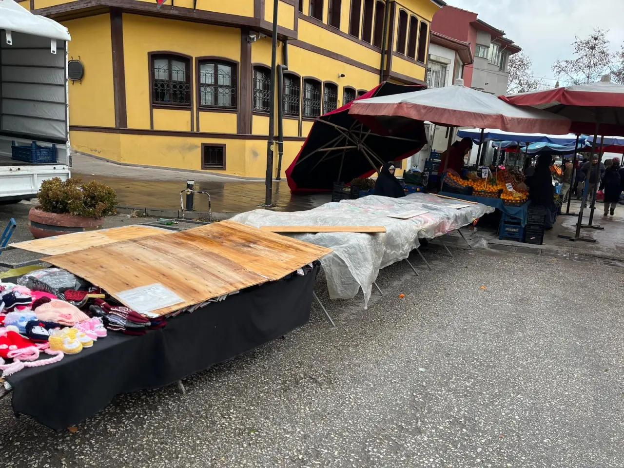Yağmur nedeniyle ürünlerini korumaya çalışan esnaf, ürünlerinin üzerini brandalarla örterek önlem aldı.