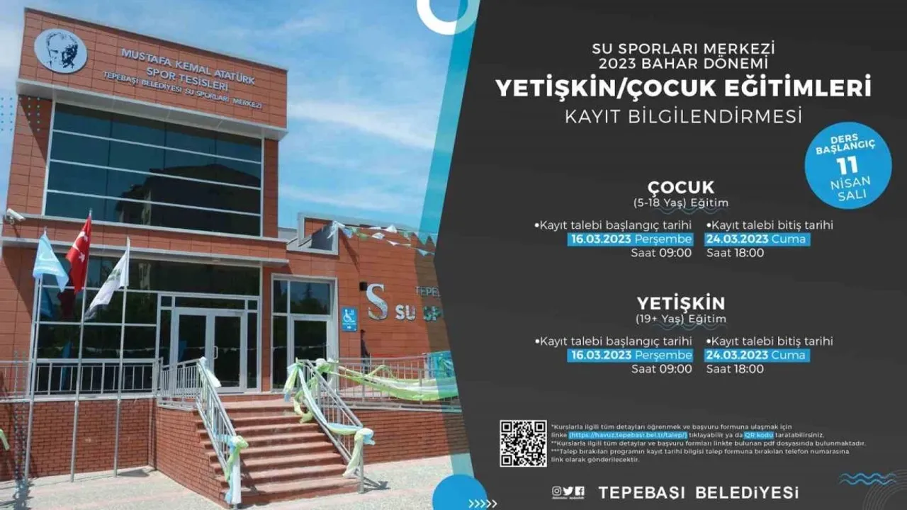 2023 Bahar Dönemi de yetişkin ve çocuklar için başlıyor. 11 Nisan Salı tarihinde başlayacak dersler için kayıt talepleri https://havuz.tepebasi.bel.tr/talep/ üzerinden 16 Mart saat 09.00 itibari ile başlayacak. 24 Mart’a kadar devam edecek kayıt taleplerinin ardından başlayacak eğitimlerden 5-18 yaş arası çocuklar ve 19 yaş üzeri yetişkinler yararlanabilecek. Kurslarla ilgili her türlü detaya ve başvuru formuna duyuru afişinde yer alan QR kod üzerinden ulaşılabiliyor.
