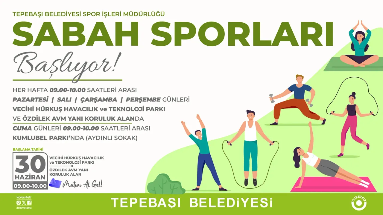 Tepebaşı Belediyesi Spor İşleri Müdürlüğü’nün organizasyonuyla gerçekleşecek sabah sporu etkinlikleri, haftanın beş günü farklı alanlarda düzenlenecek. Vatandaşlar, uzman spor eğitmenleri eşliğinde saat 09.00-10.00 arasında spor yapma fırsatı bulacak.
