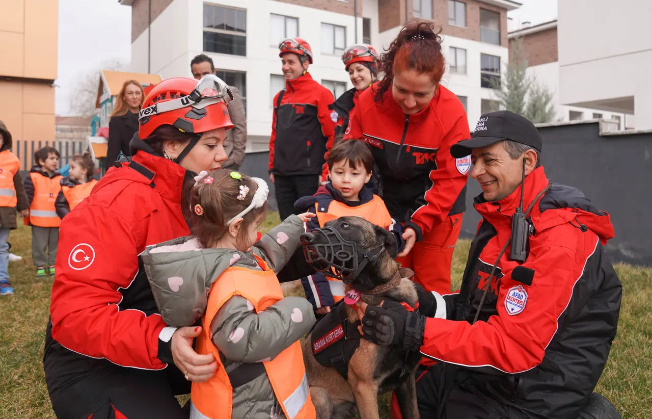 Program kapsamında minik öğrenciler, arama kurtarma köpeğiyle tanışma fırsatı buldu. Eğitim sırasında arama kurtarma köpeğinin görevleri hakkında bilgiler paylaşıldı.