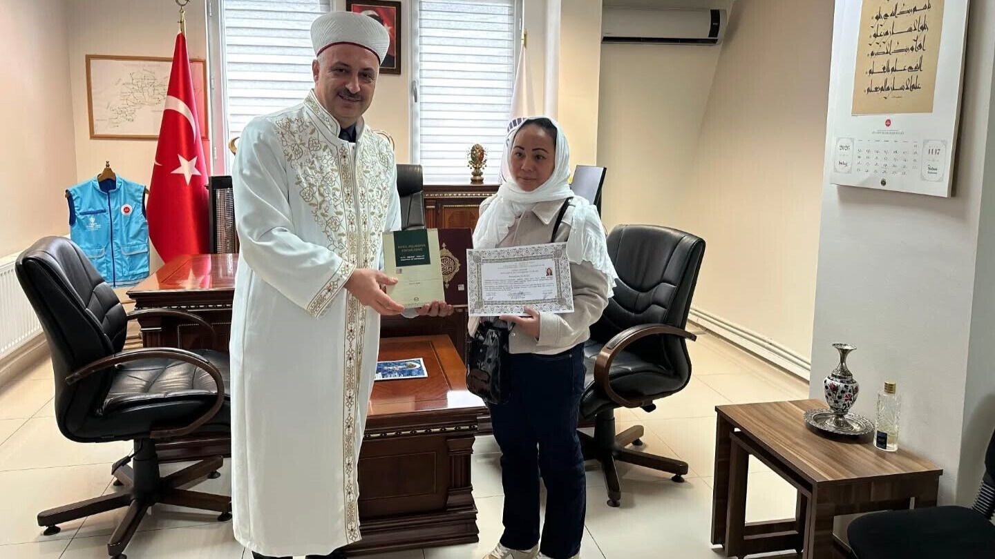 Merasimin sonunda Hayat’a ihtida belgesi takdim edilirken, İngilizce mealli Kur’an-ı Kerim ile İngilizce ilmihal hediye edildi. Program, hatıra fotoğrafı çekimiyle sona erdi.