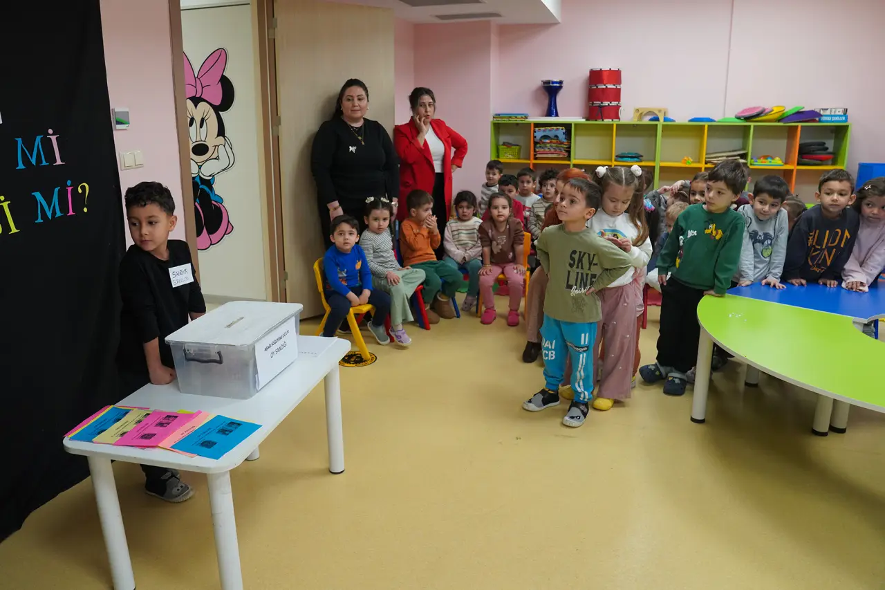 Etkinlik kapsamında, merkezde yakın zamanda düzenlenecek olan yeni yıl partisinin konseptini belirlemek için sembolik bir seçim sandığı kuruldu. Eğitmenlerinin rehberliğinde sıraya giren minikler, parti temasının saç mı yoksa makyaj mı olacağına kendi kararlarını vererek oy pusulalarına işaretledi. Ardından pusulalarını sandığa atan çocuklar, seçim sürecinin tüm aşamalarını eğlenceli bir şekilde tecrübe etti. 40 çocuğun katıldığı etkinlikte minikler; seçme-seçilme hakkı, bireysel tercih, katılım, ifade özgürlüğü gibi temel kavramlarla tanıştı. Oy verme kabinine tek tek giren çocuklar, oyunu gizli kullanma, sandığa atma ve sayım sürecine tanıklık etme gibi adımlarla demokratik kültürün temel unsurlarını yaşayarak öğrendi.
