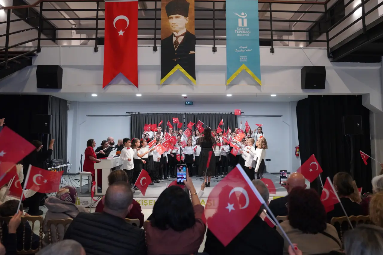 Vecihi Hürkuş Havacılık ve Teknoloji Parkı’nda gerçekleşen konserde 70 çocuk marş ve şarkıları Derya İnanç’ın şefliğinde coşkuyla seslendirdi. Salonu dolduran Eskişehirliler de ellerinde Türk Bayrağı ile coşkuya ortak oldu.
