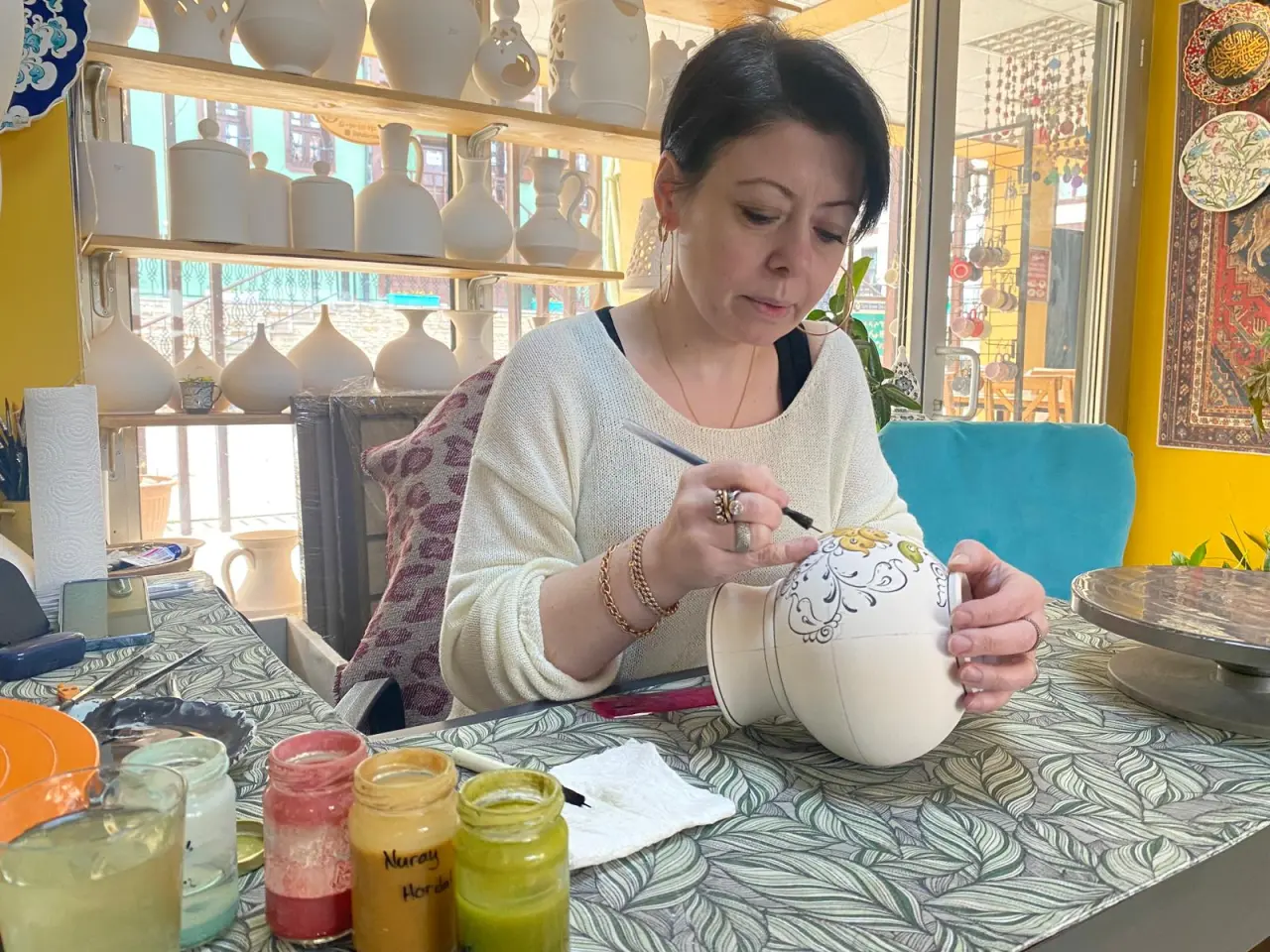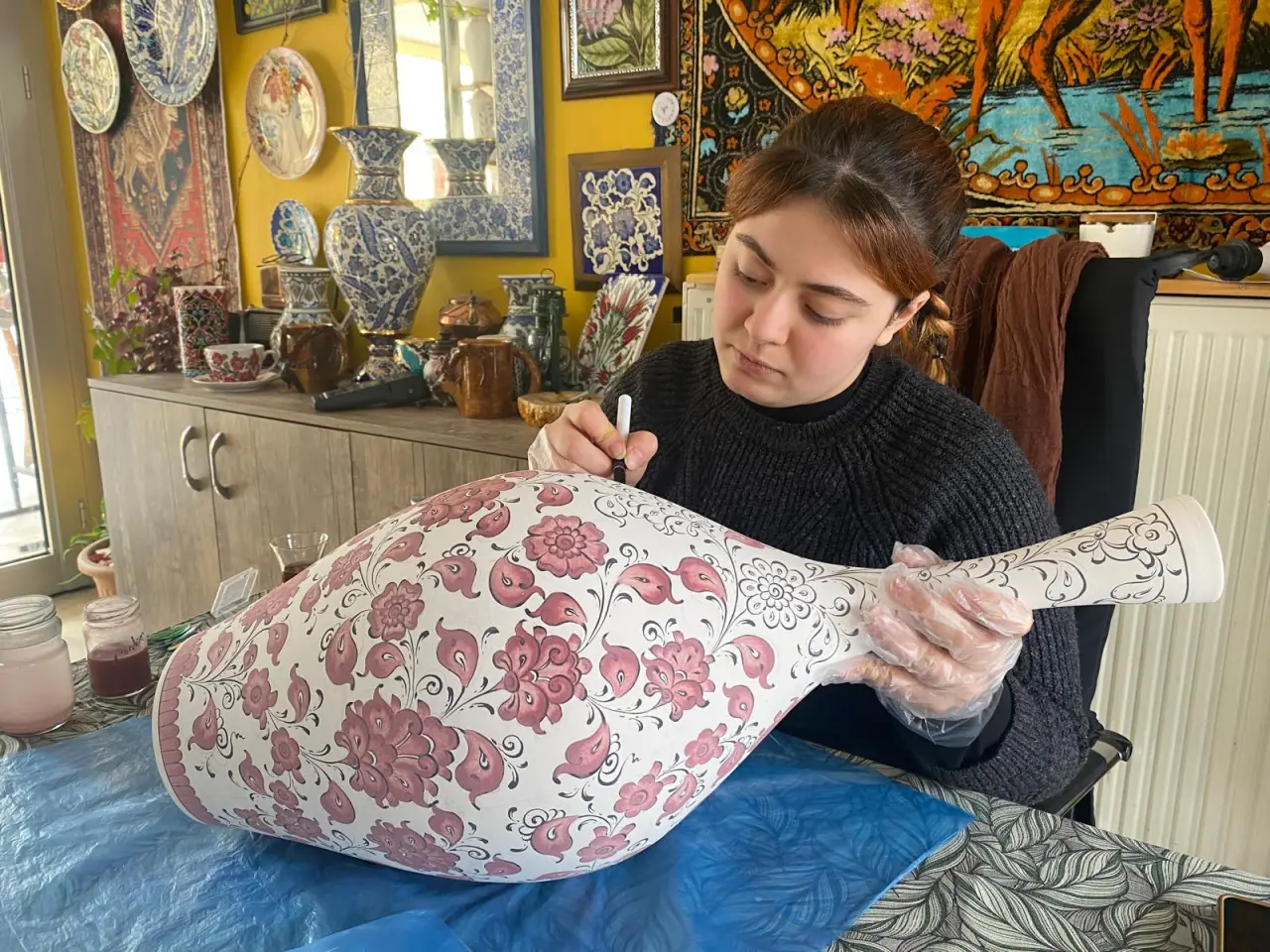 Yaklaşık 4 yıldır atölyesinde üretim yaptıklarını belirten Gül, vazo, duvar tabağı ve pano gibi dekorasyon ürünleri ürettiklerini, desen tasarımları ve altınlı işlemelerle çini objeleri süslediklerini dile getirdi.