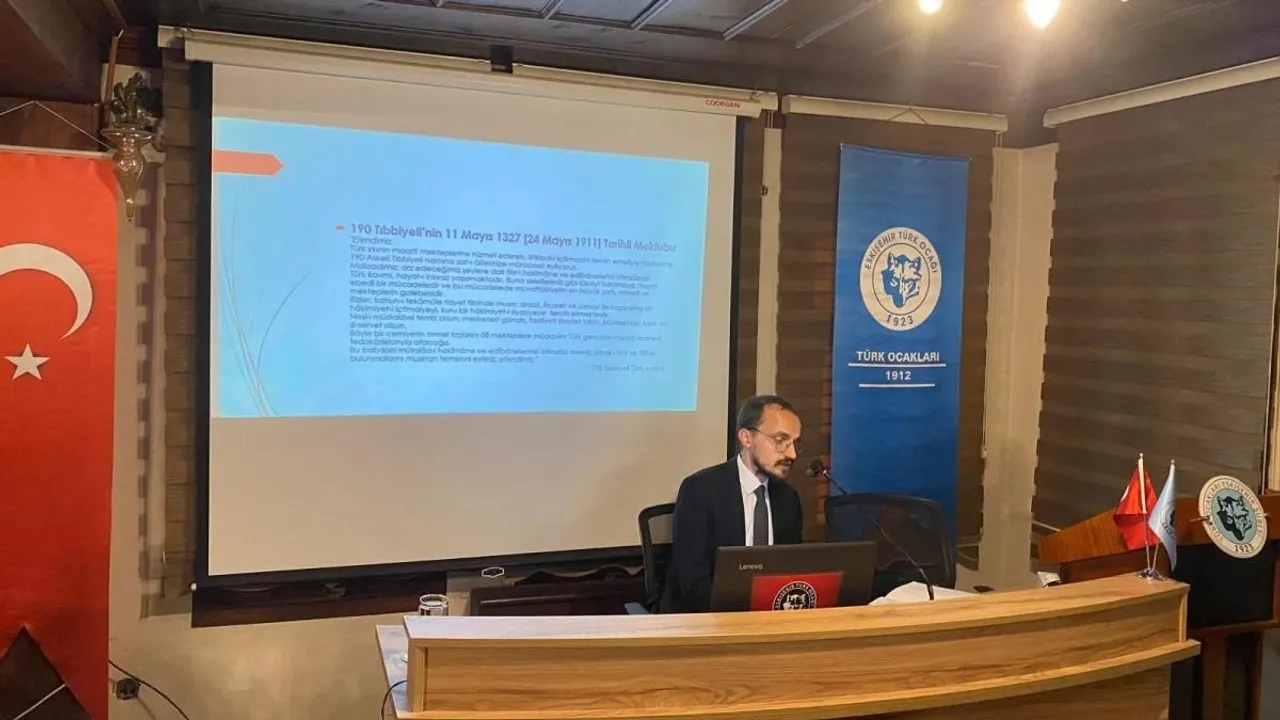 Eskişehir Türk Ocağı’nda “Milli Mücadele’de Türk Ocakları” konulu sohbete katılan Kaya, Türk Ocakları kurulduğu 1912 yılından itibaren Türk milliyetçiliğinin ve Türkçülüğün bu topraklardaki en önemli savunucuları olduğunu anlattı. Türk Ocağı’nın, Birinci Dünya Savaşı yıllarındaki faaliyetleriyle topluma Türklük bilinci aşılamış, Türkçe’nin korunmasına, Türk tarihinin gelişmesine büyük katkı sağladığını anlatan Murat Kaya, “Cemiyet ilk kurulduğu günden itibaren kendisini siyasi faaliyetlerden uzak tutarak daha çok kültür faaliyeti göstermiştir. 30 Ekim 1918 tarihinde Mondros Ateşkes Antlaşması imzalandıktan sonra, Osmanlı Devleti’nin toprakları işgal tehlikesiyle karşı karşıya kalmıştır. Bu dönemde işgallere karşı tepki gösterenlerin başında Türk Ocakları ve Türk Ocaklılar gelmektedir. İzmir’in işgal söylentileri kulaktan kulağa yayılırken, İzmir Türk Ocağı’nda yapılan toplantılar neticesinde Reddi İlhak Heyeti Milliyesi oluşturulmuş ve bu heyet Maşatlık Mitingi’ni düzenlemiştir. İzmir’in işgalinin ardından Anadolu’da ve İstanbul’da düzenlenen protesto mitinglerinde Türk Ocakları öncü rol oynamıştır. Son Osmanlı Mebusan Meclisi seçimlerinde milliyetçilerin Meclis’e girmesi için yoğun gayret gösterilmiştir. Mîsâk-ı Mîlli’nin kabulünde Türk Ocakları üyeleri yoğun gayret sarf etmiştir. İstanbul’un resmen işgal edilmesinin ardından, İtilaf Devletleri’nin ilk işgal ettiği binalardan birisi İstanbul Türk Ocağı olmuştur. Yaşanan bu gelişmelerin ardından Türk Ocağı üyelerinin bazıları Malta’ya sürgüne gönderilirken, bazılarıysa Anadolu’ya geçip Mustafa Kemal Paşa’nın yakmış olduğu Kurtuluş meşalesine güç vermiştir. Türk Ocakları, daha ilk günden itibaren Millî Mücadele’nin içerisinde yer almıştır” dedi. Konuklar tarafından ilgiyle takip edilen konuşmanın sonunda konuşmacı çok sayıda soruları cevaplandırdı. Eskişehir Türk Ocağı Şube Başkanı Prof. Dr. Nedim Ünal’ın konuşmacıya şükran beratı takdimi ile program sona erdi.