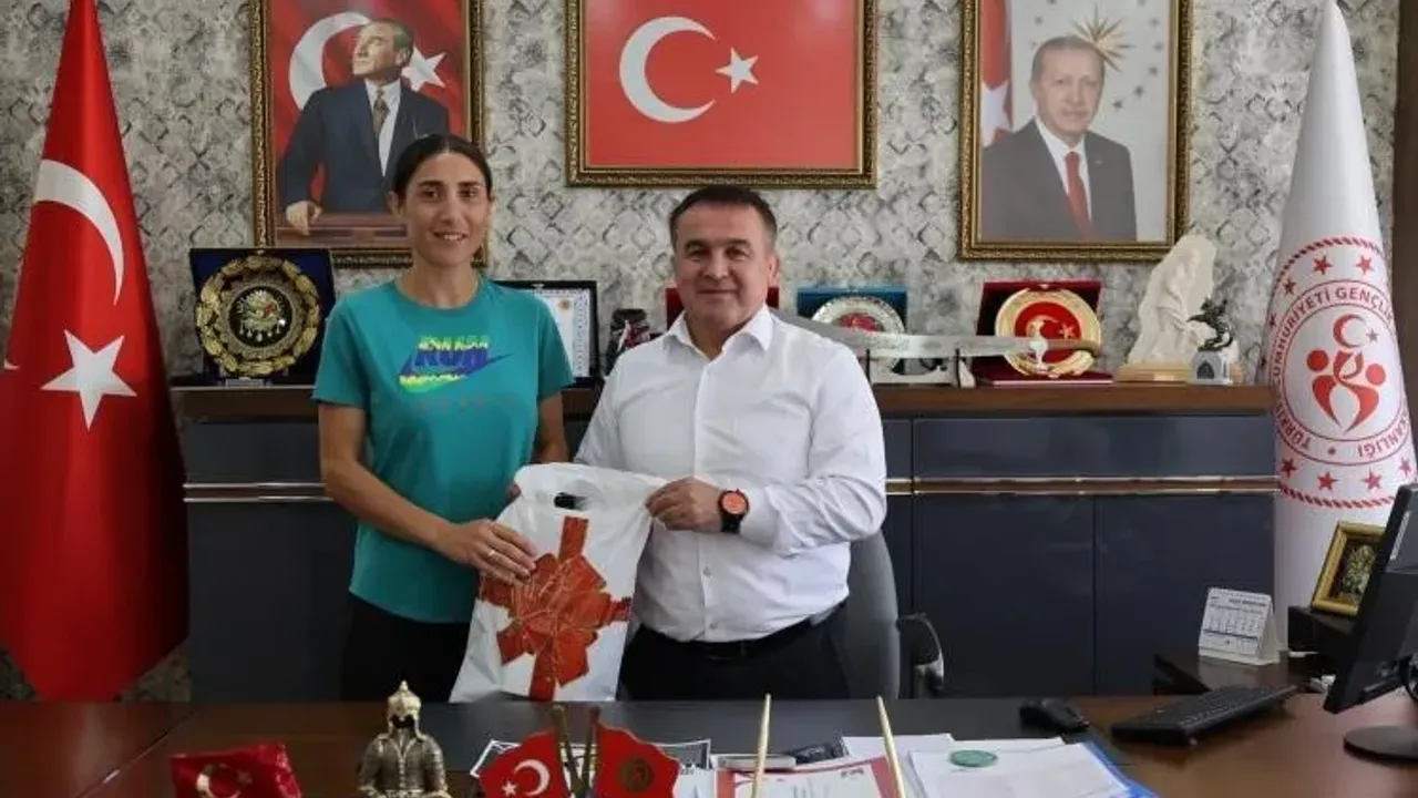 Kocaeli’nin Başiskele ilçesinde Yuvacık Barajı çevresinde düzenlenen Türkiye Dağ Koşusu Şampiyonası’nda 10 kilometrelik “Büyük Kadınlar” kategorisinde şampiyon olan Sebahat Demir, elde ettiği birinciliğin ardından İl Müdürü Ramazan Demir’i makamında ziyaret etti.