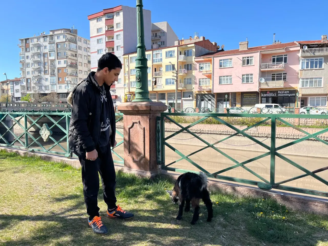 Eskişehir’in simgelerinden Porsuk Çayı, bu kez alışılmadık bir manzaraya sahne oldu. Emit Rezaah isimli genç, sabah saatlerinde küçük keçisiyle birlikte Porsuk kenarında yürüyüşe çıktı. Vatandaşlar alışık olmadıkları bu görüntü karşısında şaşkınlıklarını gizleyemezken, bazıları durup fotoğraf çekti, bazıları ise gülümsedi.