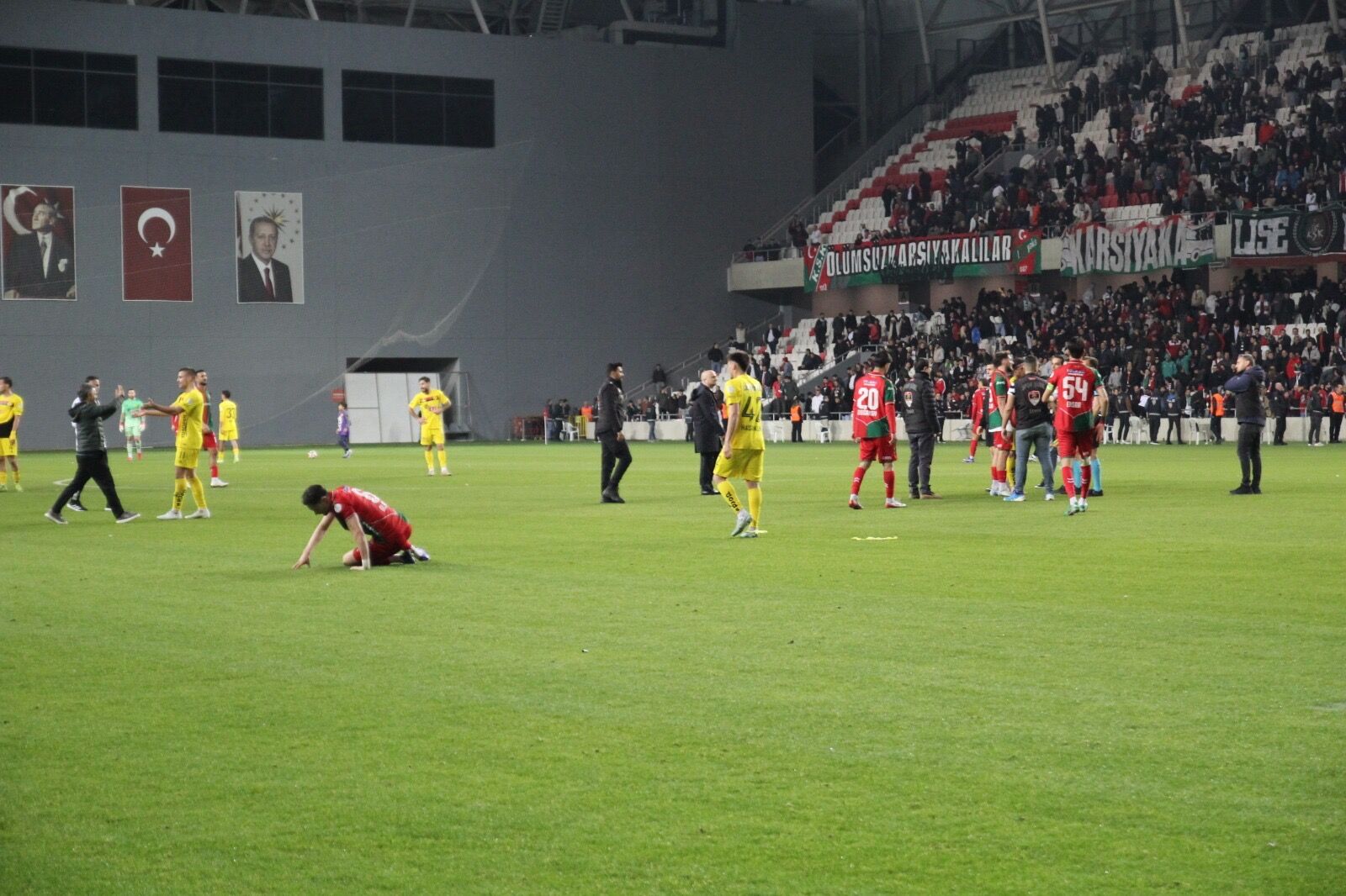 Karşıyaka taraftarlarının bir kısmından da bu protestoya alkışlarla destek geldiği gözlenirken, boş kalan deplasman tribünü maçın en çarpıcı karesi olarak objektiflere yansıdı.