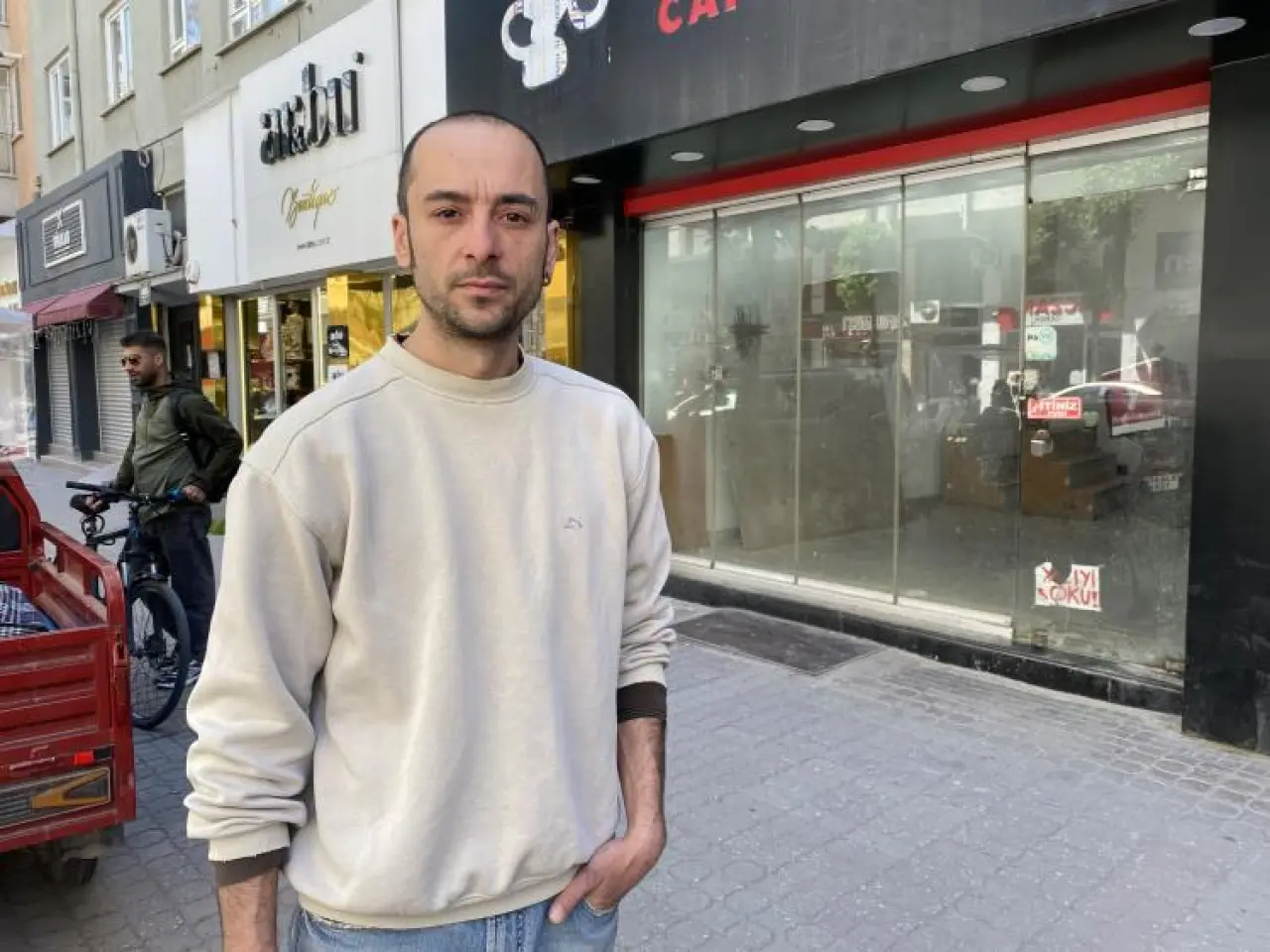 "Biz dükkanı açamıyoruz, ruhsat alamıyoruz. Yaklaşık 1 buçuk milyon liralık yatırım yaptık. Mülk sahibi buradan çıkartılmamızı talep ediyor. Biz bu konudaki hukuki mücadelemizi devam ettiriyoruz. Fakat görünen ortada. İlk girdiğimizde burası harabe haldeydi. Buranın duvarlarını, zeminini, elektrik ve su tesisatını biz yaptırdık. Usule uygunsuz olarak yapılmış asma kat vardı. Biz bu asma katı yıktığımız için mülk sahibi 100 bin TL'lik senet istedi. Usule uygunsuz olarak hem dükkanın metrekaresini genişletiyor hem de bunu usule uygun hale getirdiğimiz için bizden para talep etti. Burası binanın zemin katı. Asma kat yapılırken kolonlar kırılmış. Ne imara, ne ruhsata, ne de deprem yönetmeliğine uygun. Deprem yönetmeliği son zamanlarda ülkemizde bayağı popüler. Sonuçta büyük depremler oldu. Bizim zemin katta olan dükkanımızda kolon kırılmış durumda. Yaptığımız bütün bu yatırımların hakkını almak istiyoruz fakat mülk sahibi bizim yatırımlarımıza çökmenin peşinde."
